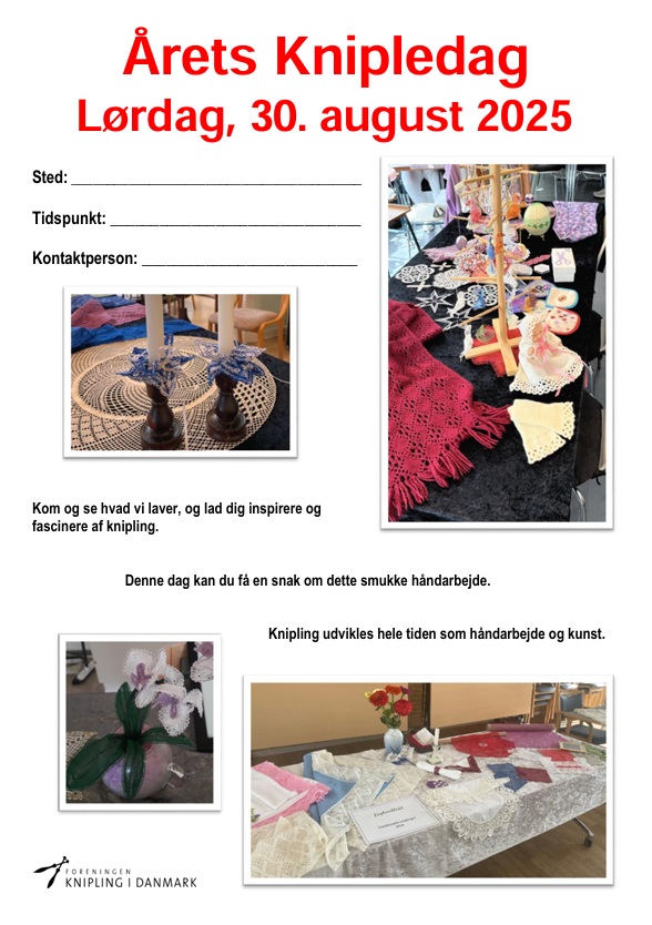 Vi håber at rigtig mange vil indsende tilmelding til Årets Knipledag til kontaktpersonen, så vi i Kniplebrevet, der udkommer i maj kan bringe er liste, over steder i landet, hvor der afholdes Årets Knipledag. Seneste indsendelse for arrangementer er 1. juni, for at det kan nå at komme i Kniplebrevet, der udkommer i august. Husk tlf. nummer eller mailadresse på kontaktperson, samt adresse på stedet, hvor arrangementet afholdes.